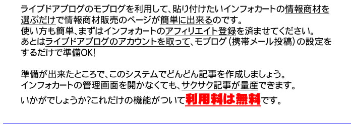 このシステムはlivedoorのブログを利用して、インフォカートの情報商材をブログ記事として簡単に投稿出来るシステムです。